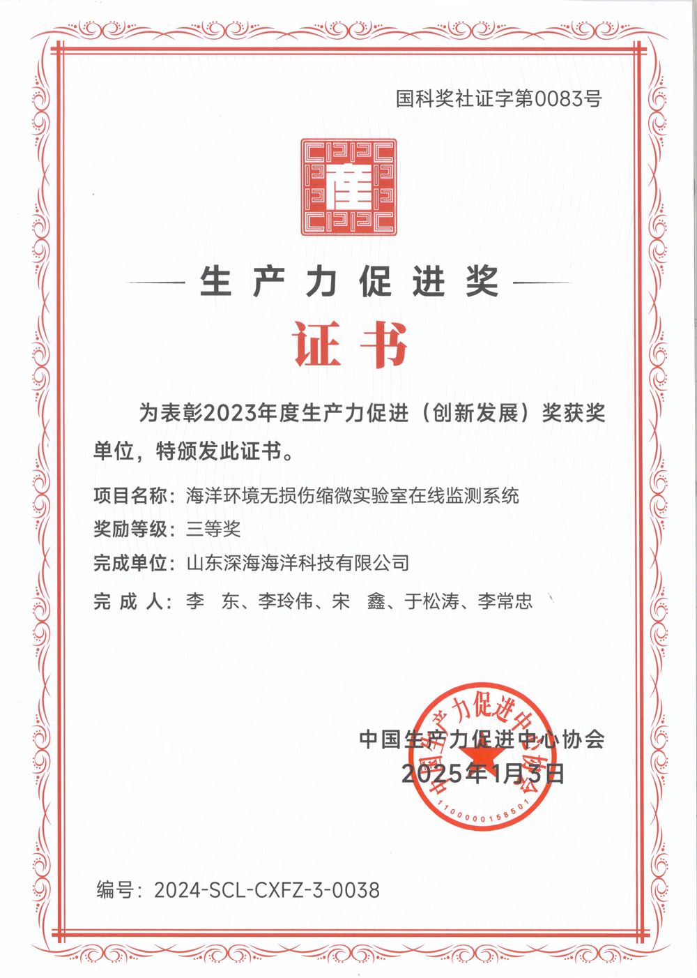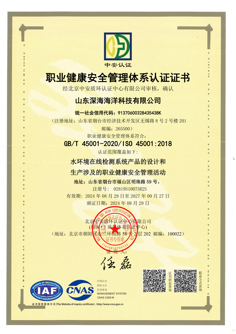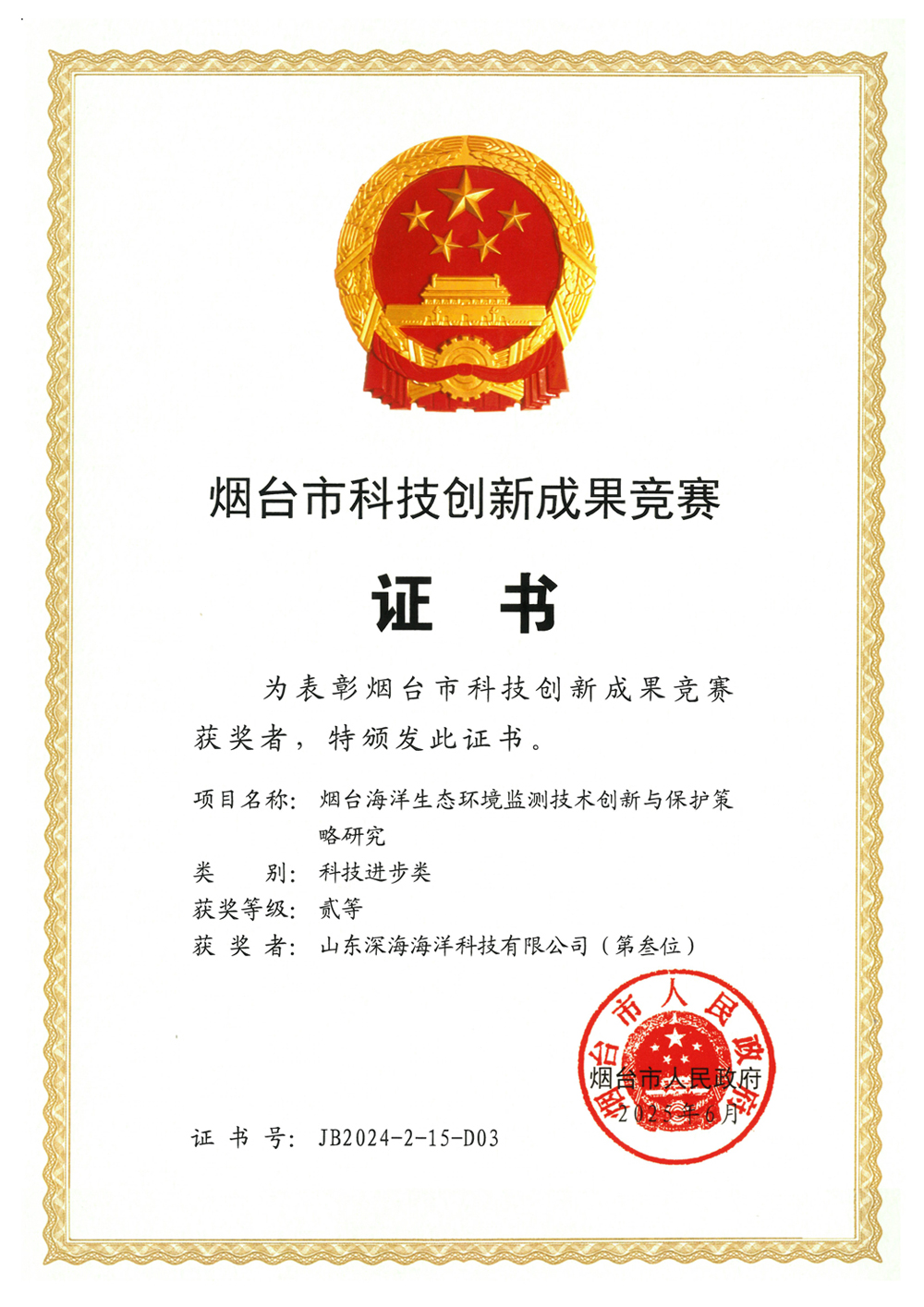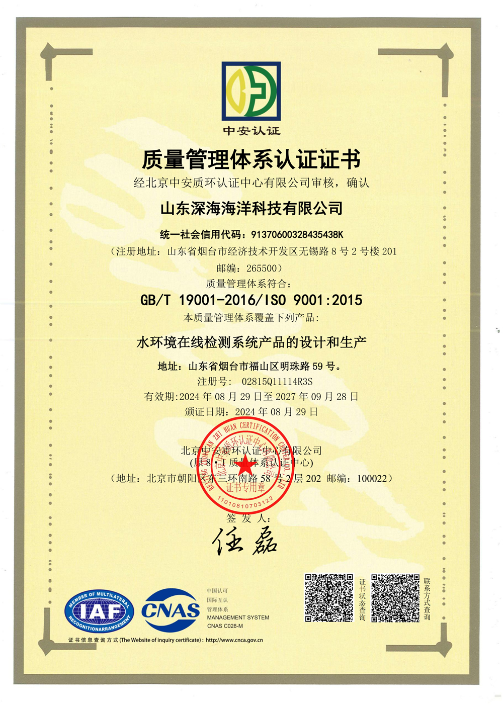 2015 年公司通过ISO9001质量管理体系认证。公司以用户为根本,创新为动力,自主研发为核心,开发出拥有自主知识产权、世界领先的缩微实验室在线监测系统,取得多项发明专利、实用新型专利和软件著作权。并作为“国家海洋局海洋工程咨询协会会员单位”参与制定《海洋环境在线水质监测系统》标准。全资子公司山东深海海洋科技分析测试中心有限公司,属第三方检测公司,目前已有包括海水、地表水、海洋气象、大气降水等10个领域、123个检测方法通过了CMA计量认证。